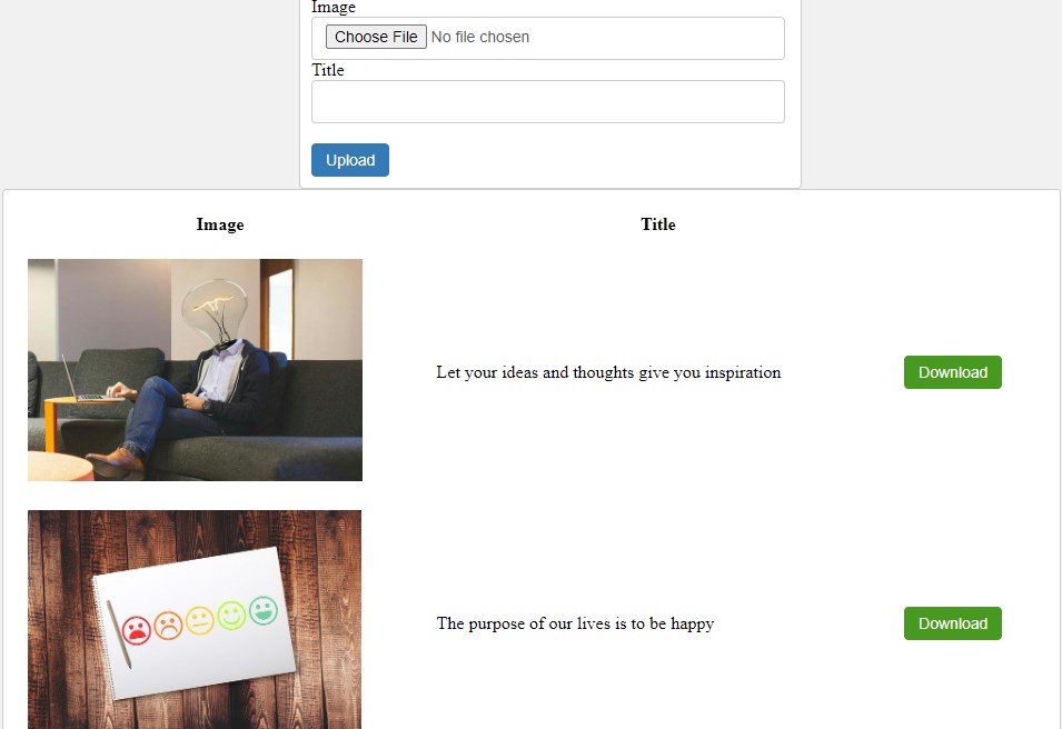 According to the CRUD application, we have to fetch the database from the database and display it in a table. Here we will follow the same. We will fetch the image name and title from the database and will display them in an HTML table with the download button. The download button will be used to download the image from the server. We will create code for image upload and display it in the same file.