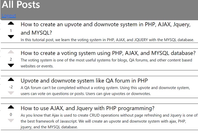 In this tutorial, we will learn how to create an upvote and downvote system using PHP, AJAX, and MYSQL databases. We will use PHP PDO prepared statements to make a secure system and JQuery, bootstrap. As you know, we use bootstrap to make a responsive website using readymade CSS classes. Ajax is used to perform CRUD operations without page refreshing and JQUERY is a JavaScript open source framework that helps to reduce JavaScript code lines and is easy to write and understand. The Upvote and downvote system is mostly used for QA forum websites or event websites like Techno Smarter QA, Stackoverflow, and Question2answer. This is known as the voting system or like and unlike system. You can use it as a voting system for kinds of websites in PHP. Upvote means that you like this post, question, or answer and downvote means that you don’t like this post, question, or answer. We will use PHP PDO prepared statements to avoid SQL injection and direct attacks. This is the most important thing that you avoid SQL injection with prepared statements and also direct attacks. This will complete the secured upvote and downvote system using PHP, AJAX, Jquery, Bootstrap, PDO prepared statements and the MYSQL database.